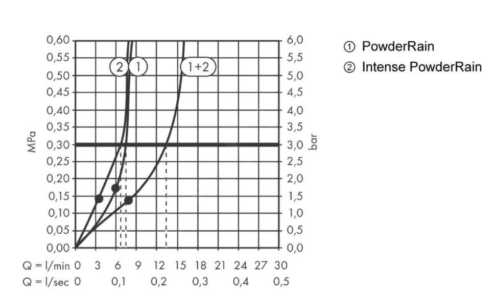 - Durchfluss Intense PowderRain (0,3 MPa): 6,5 l/Min