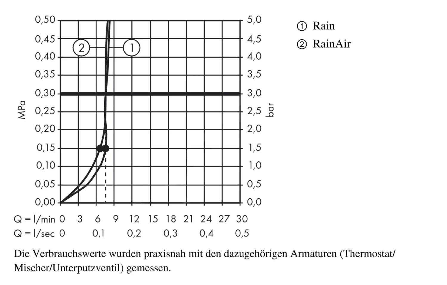 - Durchflussmenge RainAir Strahl (bei 3 bar): 9 l/min