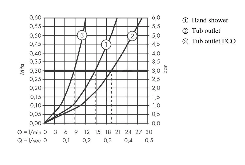 - Durchflussmenge (Wannenauslauf) bei 0,3 MPa: 19,5 l/min
