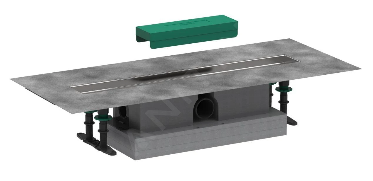 Für das komplette Produkt muss eine von den Abmessungen her geeignete Duschrinne mit Gitter bestellt werden, die kein Bestandteil der Lieferung ist.